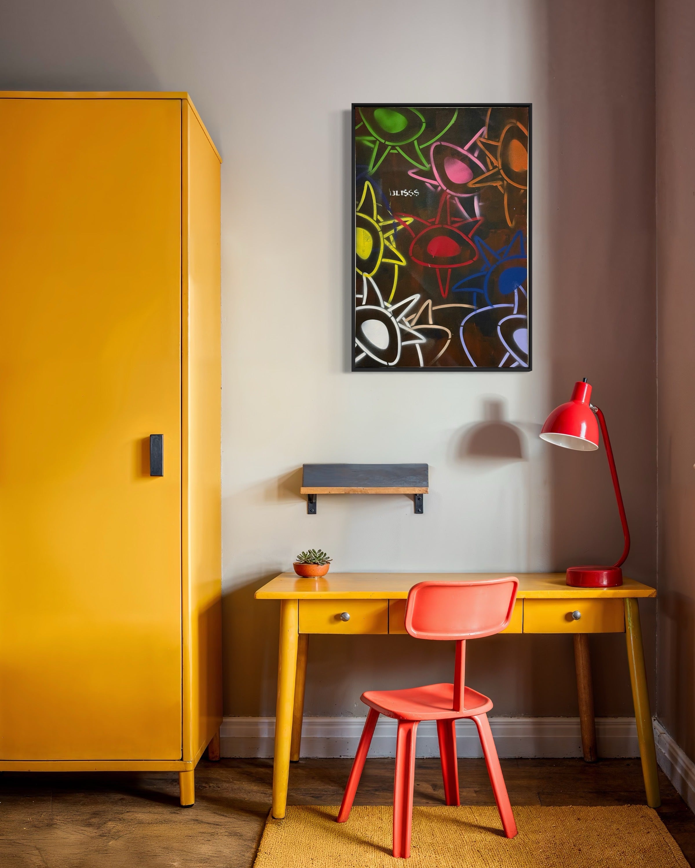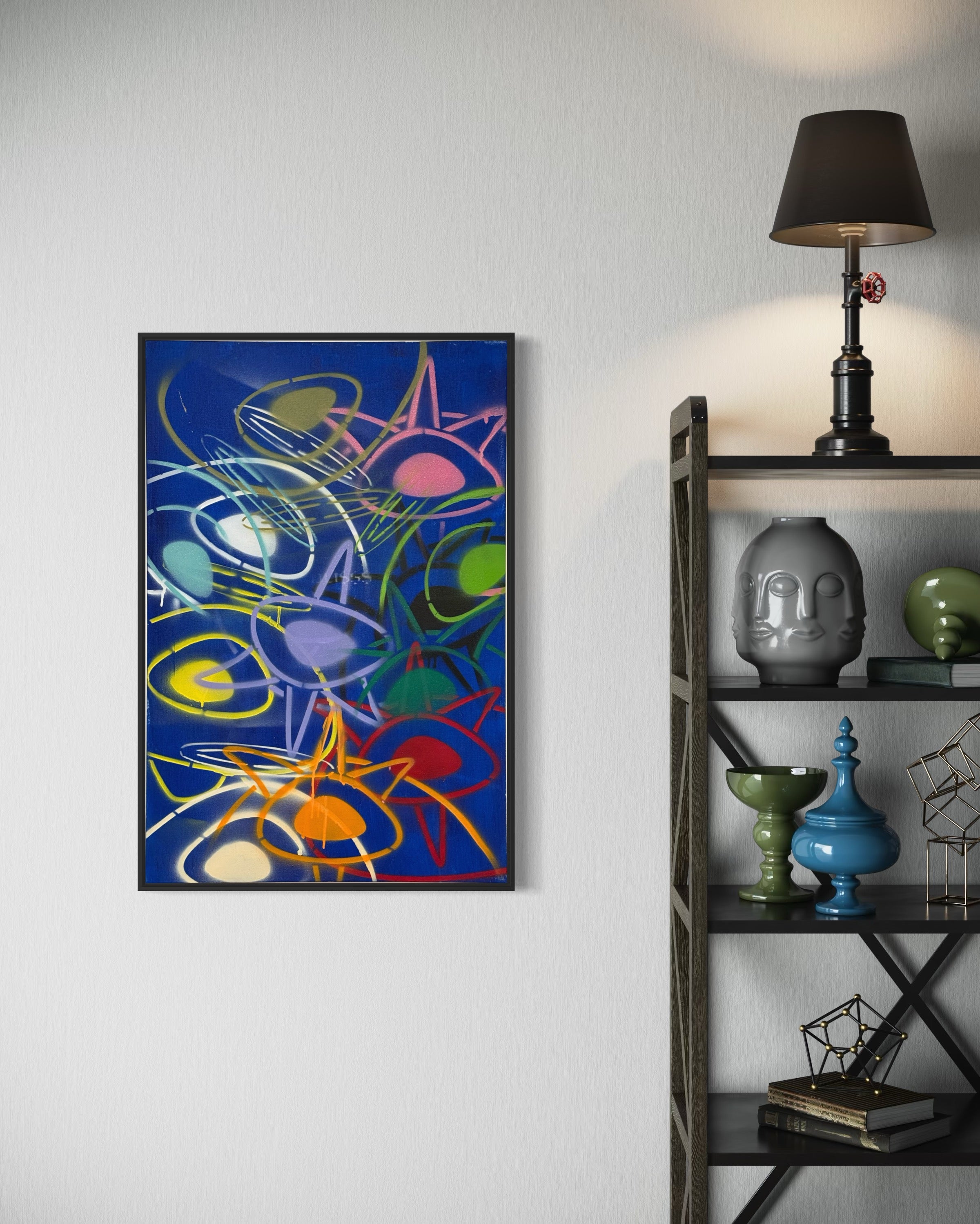 a universe of suns, halos, and orbiting color. each piece is a snapshot of energy in motion—part graffiti, part galaxy map.